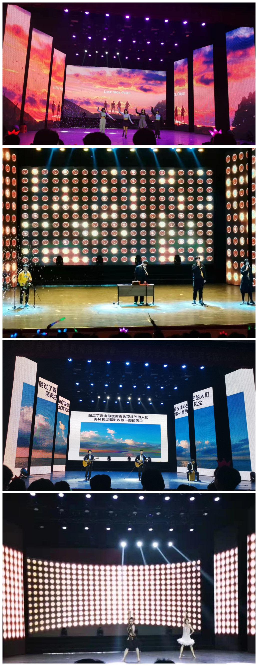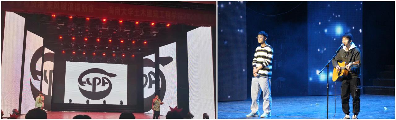 接下来进入第二篇章:“凝心土建,闯自贸新路”。“Air乐团”陈泓圳、彭莘迪、武文涛、胡嘉欣带来了歌曲《R&B All Night》,四位来自pg游戏官网不同年级、不同专业的同学,因为共同的爱好走到一起,利用课余时间切磋音乐、交流思想,展现了当代青年积极向上的风采,是pg游戏官网学子丰富校园文化生活的一个缩影;兄弟学院的朋友也来为我们助兴,国际旅游学院吕小艺、刘丽雅、李骅遴、张倩颖给观众们带来了魅力四射的现代舞《love sick girl》;校企合作一直是pg游戏官网工作的亮点之一,本次晚会我们还邀请了中建八局南方公司海南分公司代表为我们带来了他们的原创歌曲《建筑之梦》和《我们的时光》,用土建人的方式唱出了我们建设祖国、砥砺奋进的决心和梦想;刘星悦、穆俊伶带来的拉丁舞表演以及学院文工团舞蹈部带来了舞蹈串烧,让大家欣赏到不同舞种的独特魅力。