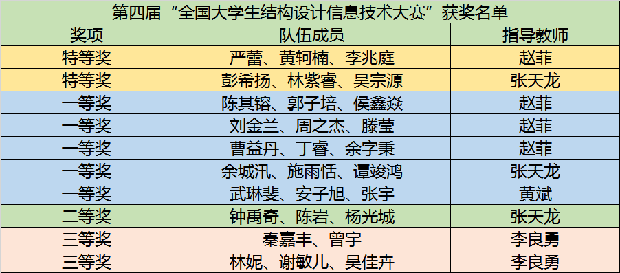 2022年5月10日,第四届“全国大学生结构设计信息技术大赛”获奖名单公布,由pg游戏电子模拟器BIM协会选拔的10支队伍参赛并全部获奖,获奖率为100%!其中荣获特等奖2支队伍,一等奖5支队伍,二等奖1支队伍,三等奖2支队伍。可喜可贺的是,由赵菲老师指导的“pg游戏电子模拟器(严蕾、黄轲楠、李兆庭)”团队以95.25的高分获得全国特等奖第一名!除此之外,赵菲老师和张天龙老师获优秀指导教师奖。