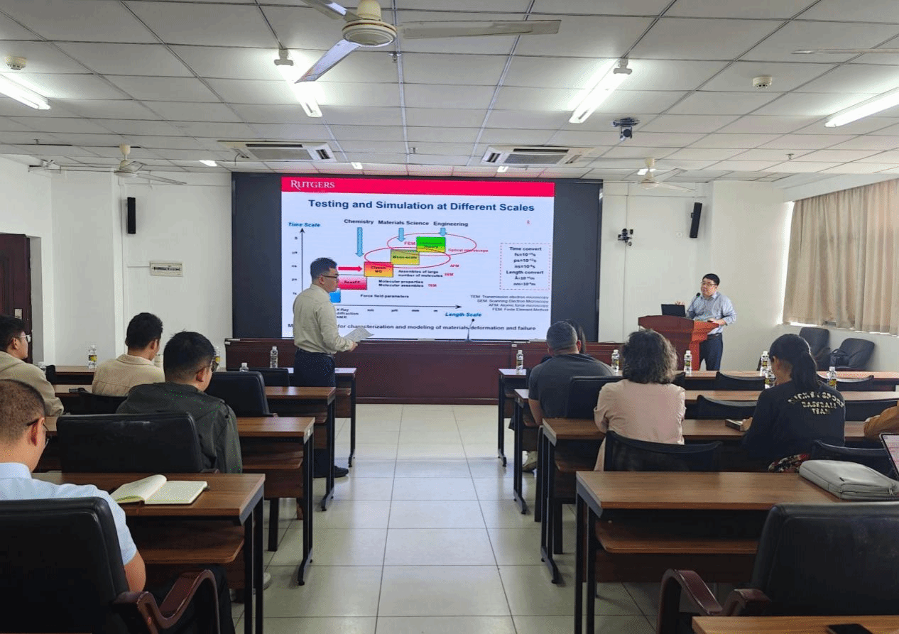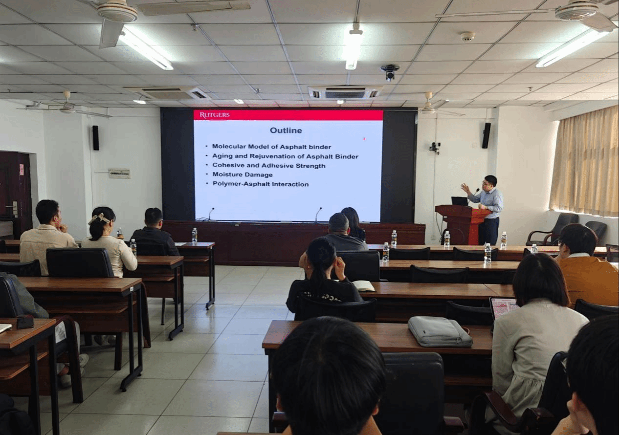 2025年12月29日上午,热带海洋土木建筑讲坛第二十讲在学校研发楼510会议室顺利举行。受pg游戏电子模拟器刘婉秋教授邀请,美国罗格斯新泽西州立大学土木与环境工程学院汪浩教授作了题为《沥青材料的分子模拟方法和应用》的学术报告。
