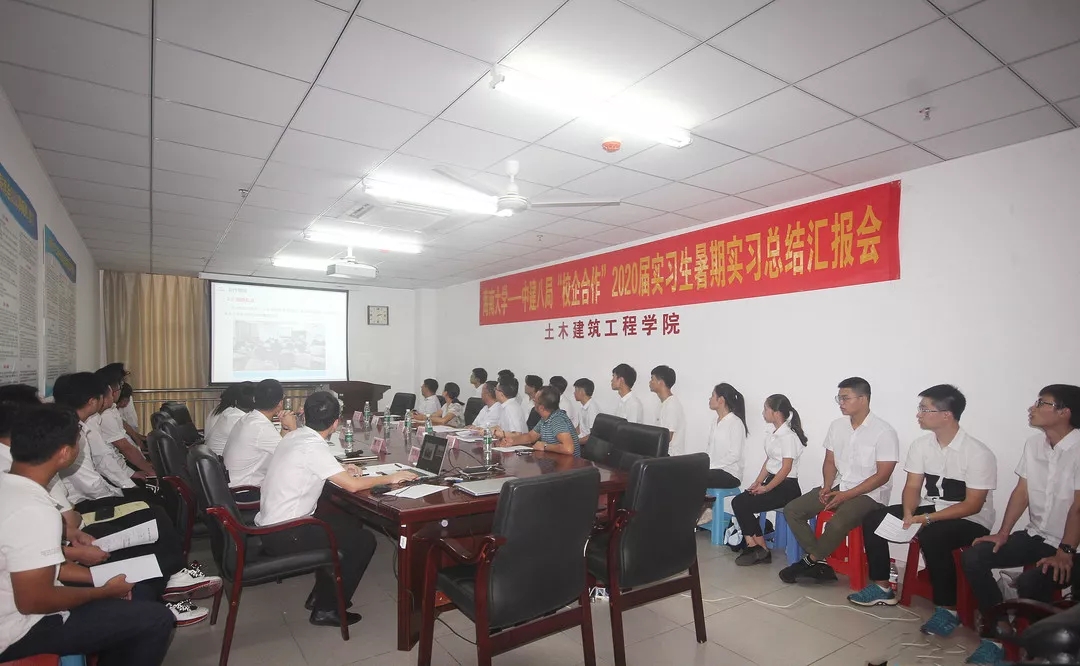 为进一步加强校企合作,提升合作内涵,充分发挥校外实习实践基地的平台作用,进而促进本科教学质量的提升,促进学生专业认知,提高专业实操技能,pg游戏电子模拟器与中建八局于2019年8月15日合作举行“校企合作”2020届本科实习生暑期实习总结汇报会。参加汇报会的领导有:pg游戏电子模拟器党委卢江海书记、学院党委罗邻球副书记、学院邱宙廷副院长、陈云副院长、学工办詹达夫副主任,中建八局华南公司人资部马园园经理,海南分公司党委书记、总经理简俊敏、副总经理曹阳、总会计师李诚等;22名在中建八局实习的2016级本科生在会上做了实习汇报与小结。