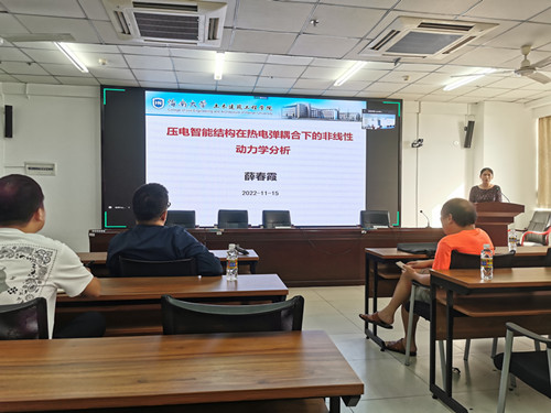 11月15日下午16:00-17:00,pg游戏官网教师薛春霞教授(2021年10月份入职)在研发楼510做了题为《压电智能结构在热电弹耦合下的非线性动力学分析》的学术报告,会议采用线上、线下相结合的方式进行。学术报告会由辛大波教授主持,他介绍了pg游戏官网新入职教师系列学术报告活动安排,并介绍了本次报告人薛春霞教授的科研成果相关情况。学院教师、研究生50余人通过现场和腾讯会议聆听了报告会。