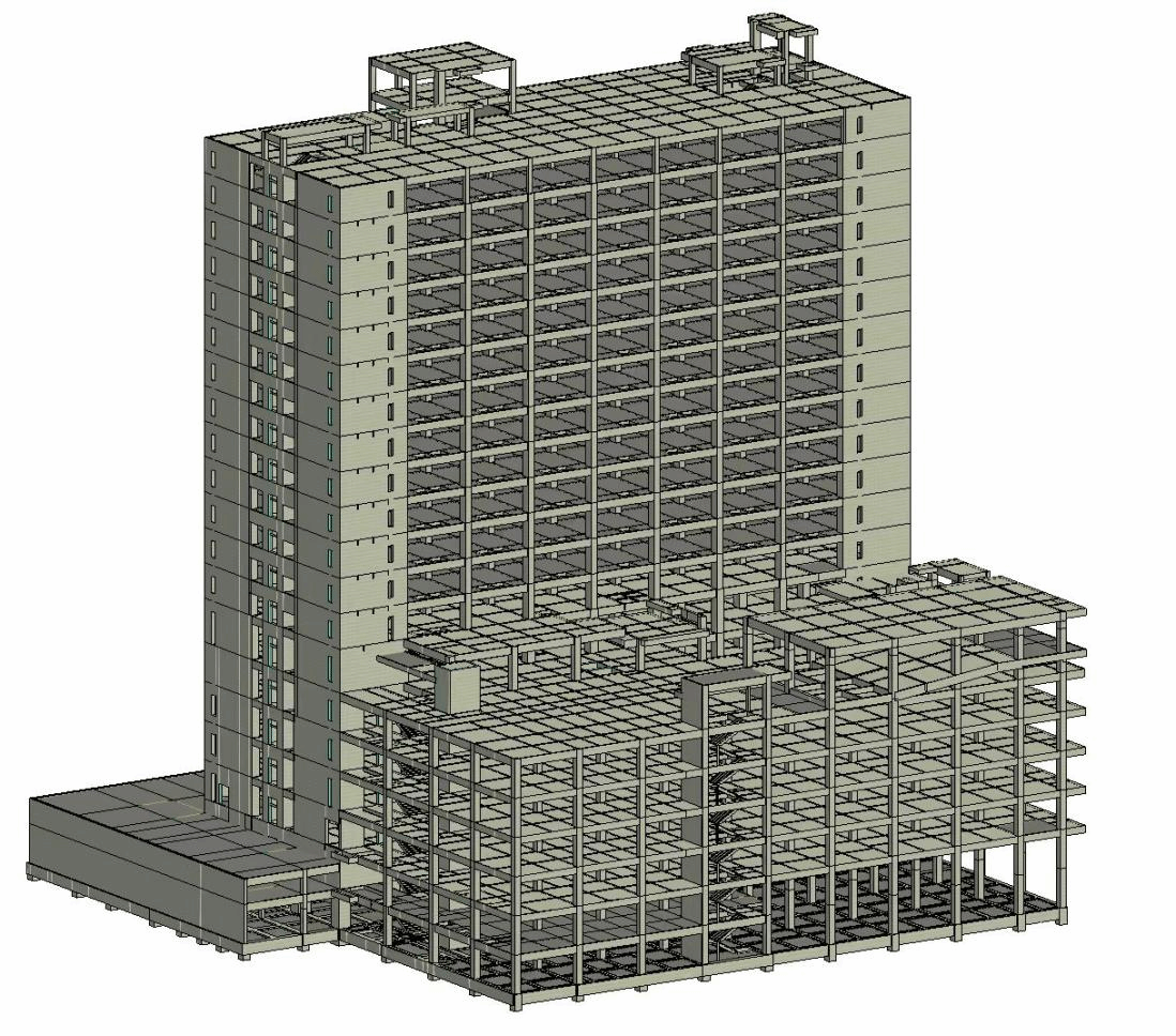 这届大赛A组赛题为装配整体式医疗建筑,建筑面积达55246.6平方米,高度达79.30米,在实际项目设计中属于中高难度。要求采用BIM技术对门急诊住院综合楼进行结构建模、计算分析、深化设计以及生成施工图,并完成思考题。为了充分发挥校企合作的优势,学院还与海南海大工程设计研究院开展合作,邀请设计院总工黄利参与竞赛,指导同学们运用专业知识解决了项目设计中的许多难点。难点之一就是结构模型的建立,特别是阶梯式报告厅和局部转换层的建模,并根据计算结果对模型不断进行优化和调整,最终解决了重点设防类医疗建筑的超筋超限问题,使得结构整体控制指标满足设计规范要求。