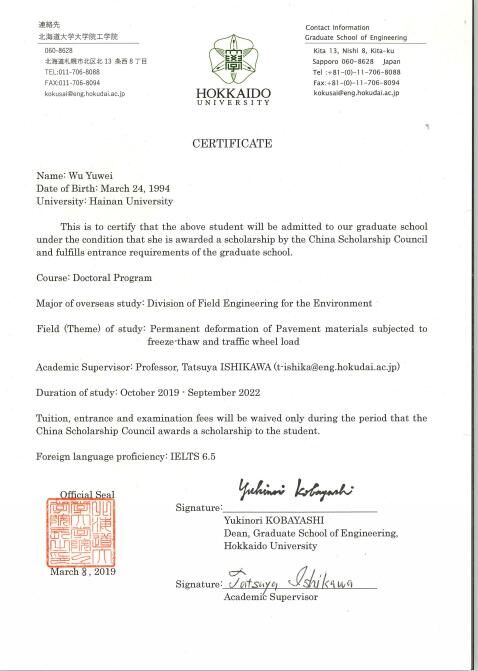 经过国家留学基金委(CSC)评审,2019年度国家公派研究生项目录取结果陆续公布。pg游戏电子模拟器硕士研究生吴雨薇成功获得国家留学基金委员会资助,将前往日本北海道大学攻读博士研究生学位,这是pg游戏官网首次获得国家公派博士研究生项目资助,特此祝贺!