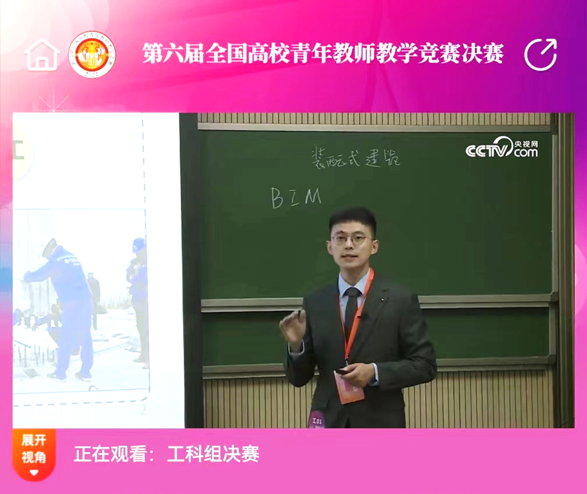 pg游戏官网张天龙老师的参赛课程名称为《建筑信息模型(BIM)技术应用》,参赛课程随机抽取的教学内容为“12-BIM在装配式建筑施工中的应用”,最终以总分90.11排名工科组第八名并荣获二等奖。教育部明确对于所有获奖选手,将在教师职称评审中体现教育教学实绩,在相关荣誉表彰等方面予以倾斜。学院将继续充分发挥青教赛在教书育人中的示范带动作用,进一步推动pg游戏官网青年教师队伍建设改革。