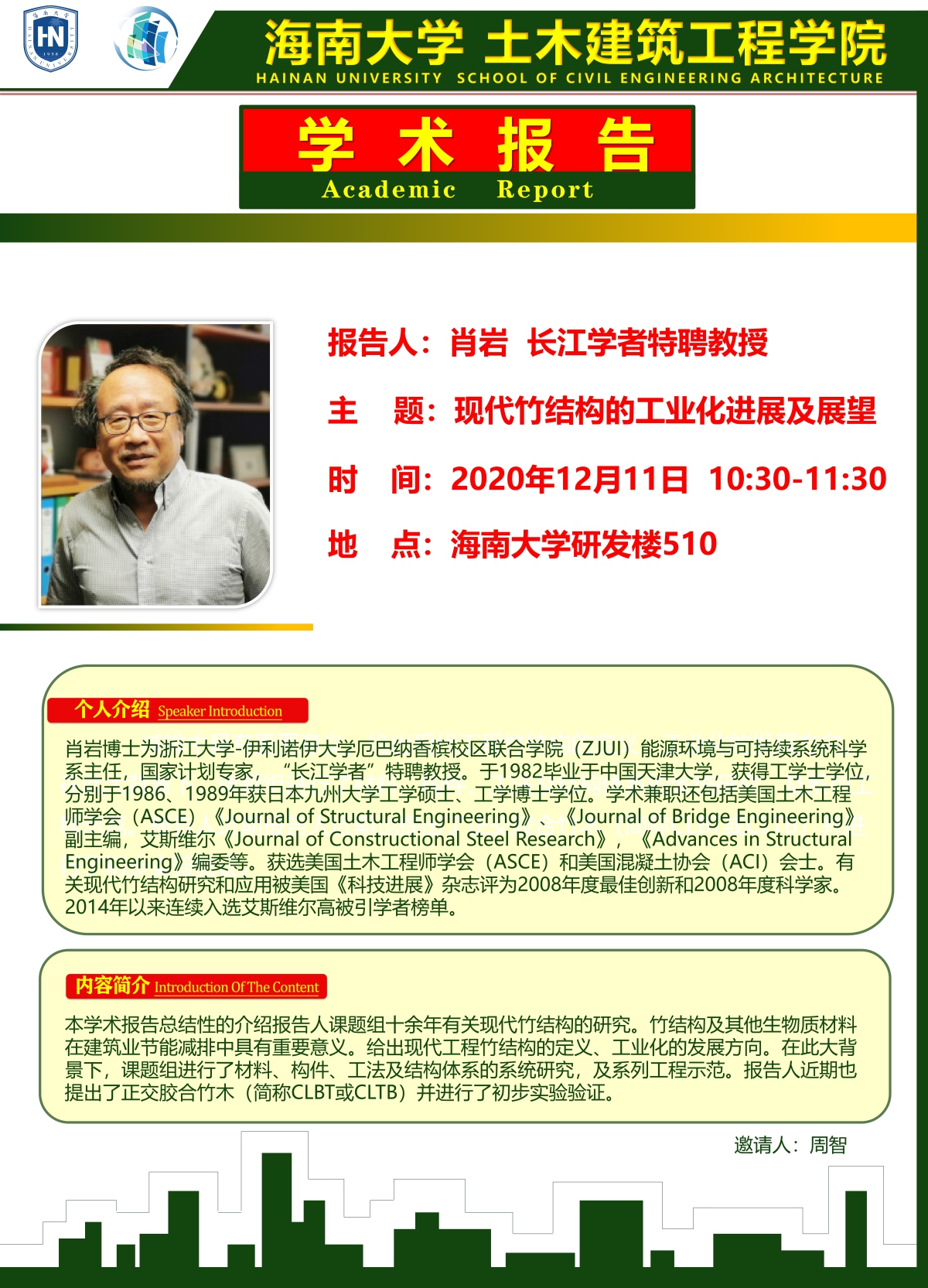 12月11日(星期五)上午10:30-11:30点,肖岩教授在研发楼510室,做《现代竹结构的工业化进展及展望》学术报告,请当天上午没有课的研究生必须参加学术报告会,同时欢迎感兴趣的本科生和研究方向相关的老师参加。