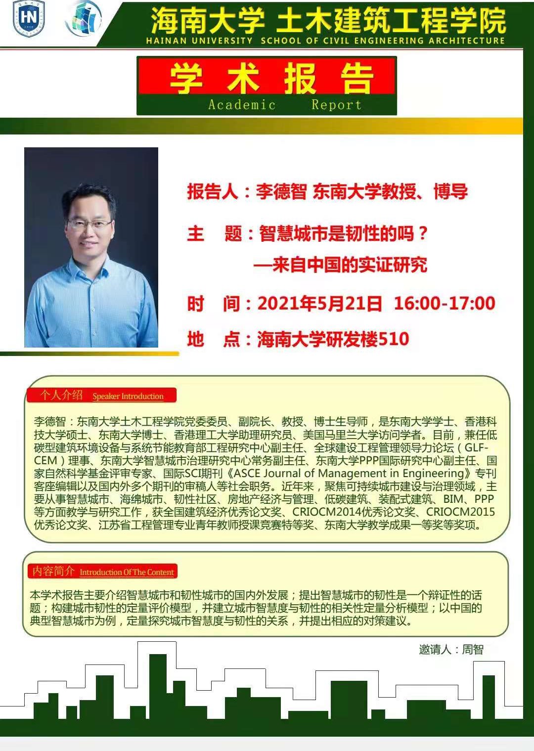 5月21日(周五)16:00-17:00点在pg游戏电子模拟器研发楼510,东南大学土木工程学院副院长、博士生导师李德智教授在pg游戏官网做题为《智慧城市是韧性的吗? —来自中国的实证研究》学术报告。欢迎有兴趣的老师和没有课的研究生参加。特此通知