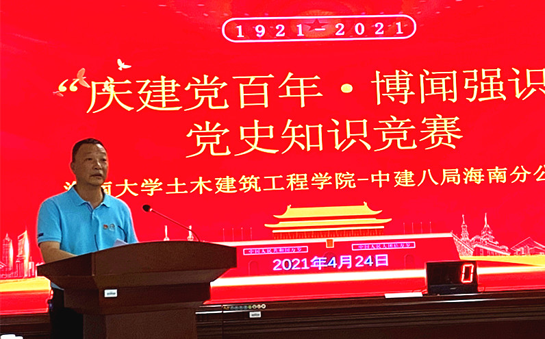 4月24日,pg游戏电子模拟器中国建筑第八工程局有限公司海南分公司联合举办“庆建党百年·博闻强识”党史知识竞赛活动。pg游戏电子模拟器党委书记卢江海、副书记孙晓媛、副院长邱宙廷、学工办主任李江俊,中建八局海南分公司工会主席李诚、安全总监李神养、综合部主任邵青晓及百余名师生参加了活动。